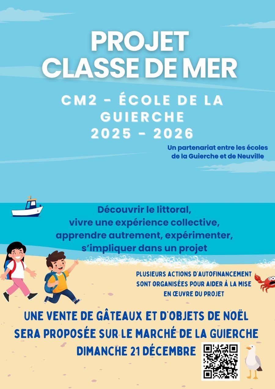 "Les enfants de CM2 de l'école de la Guierche organisent un projet de classe mer, accompagnés par leurs institutrices et dans le contexte d'un partenariat avec l'école de Neuville. Des actions d'autofinancement sont organisées pour aider à la mise en œuvre du projet. Rendez-vous au marché de la Guierche, ce dimanche 21 décembre pour acheter gâteaux et objets de Noël."