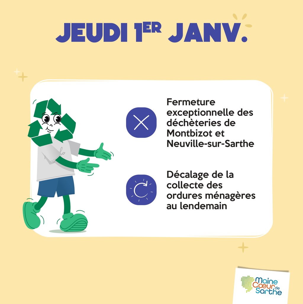 👉 Les déchèteries de Montbizot et Neuville-sur-Sarthe seront exceptionnellement fermées le jeudi 1er janvier 2026.