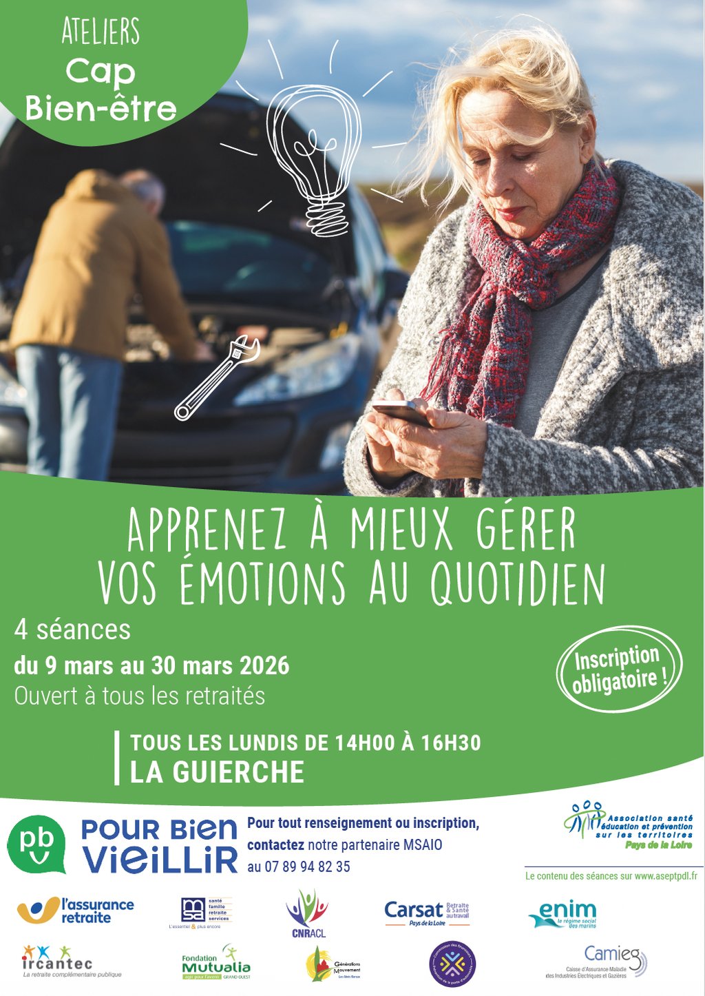 La commune de La Guierche propose, en partenariat avec MSAIO, une série d’ateliers Cap Bien-être destinés à tous les retraités. Ces ateliers auront lieu chaque lundi, du 9 mars au 30 mars 2026, soit 4 séances au total. Les participants sont attendus de 14h à 16h30 pour partager des moments conviviaux et s’initier à des activités favorisant le bien-être.