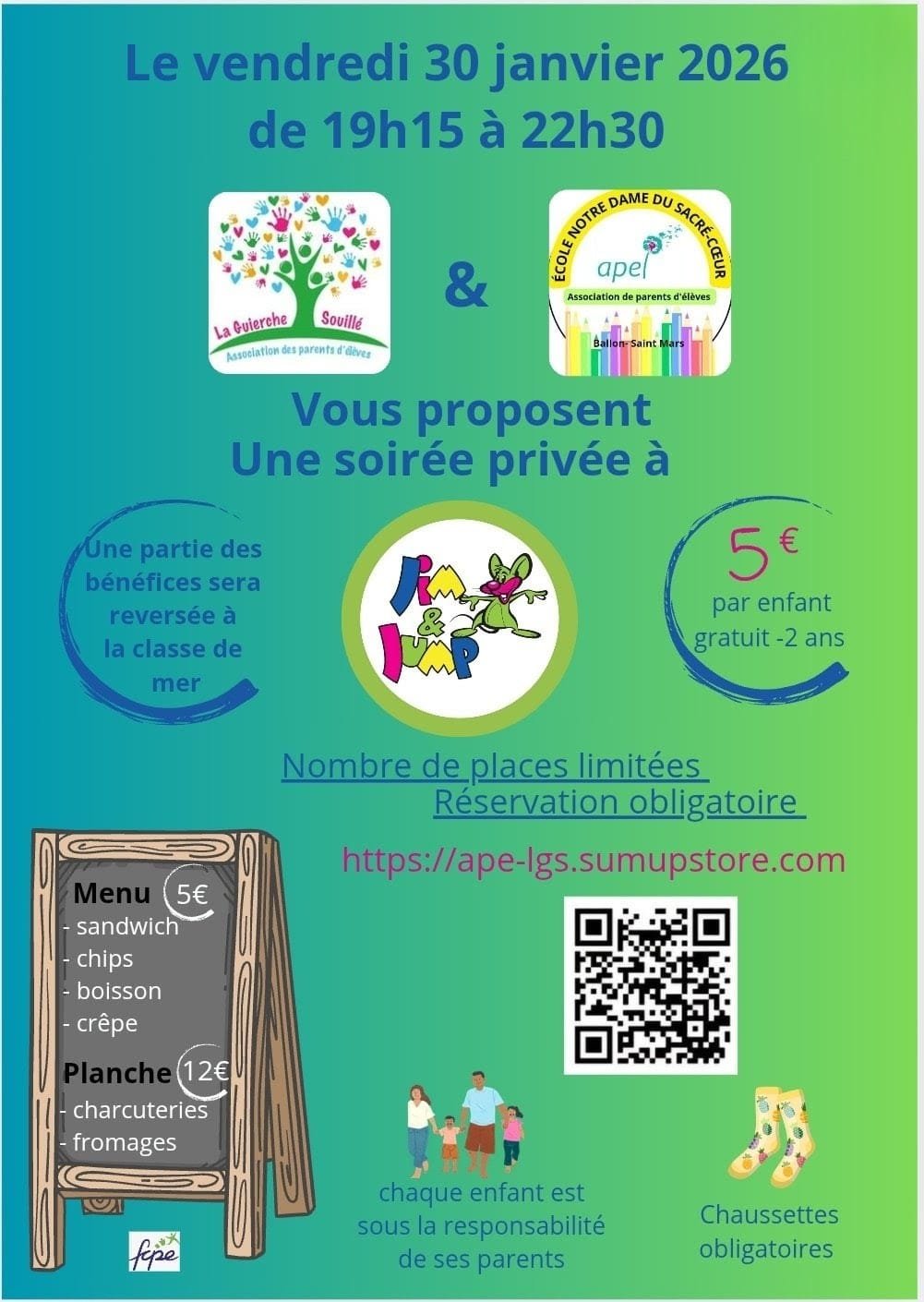 Le vendredi 30 janvier 2026, de 19h15 à 22h30, l’association des parents d’élèves (APE) La Guierche – Souillé vous invite à une soirée privée chez Jim & Jump. Venez partager un moment de détente et de plaisir en famille ou entre amis, tout en soutenant la classe de mer !