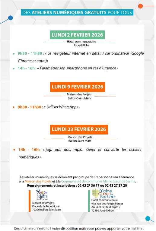 Les ateliers numériques se déroulent par petit groupe de 6 personnes maximum tous les lundis, en alternance à l'hôtel communautaire, à Joué-l'Abbé, et à la Maison des Projets à Ballon.