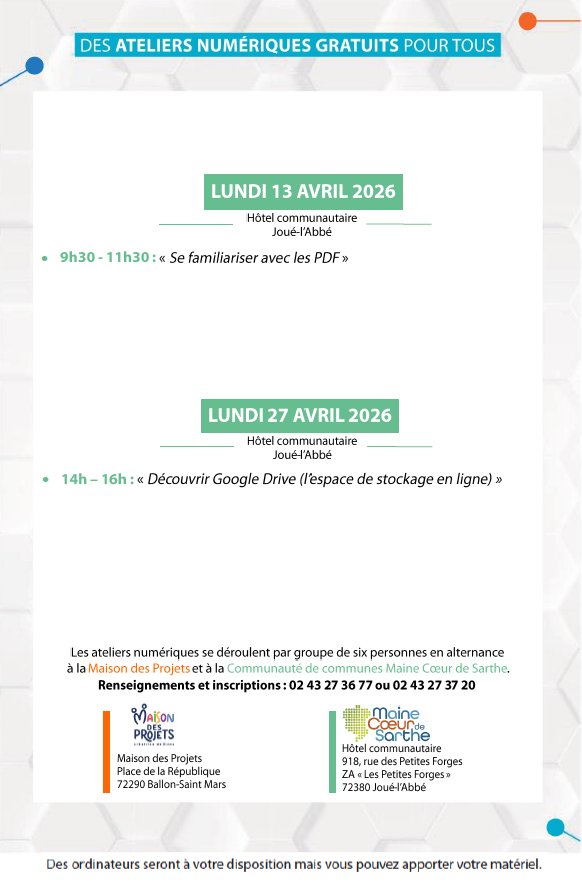 Les ateliers numériques se déroulent par petit groupe de 6 personnes maximum tous les lundis, en alternance à l'hôtel communautaire, à Joué-l'Abbé, et à la Maison des Projets à Ballon.