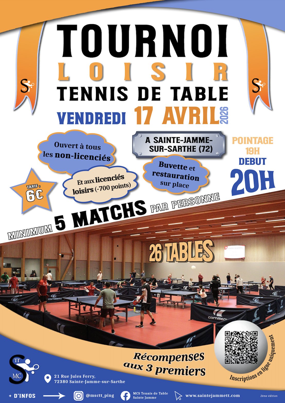 Un tournoi Loisir lancera les festivités le vendredi soir à partir de 19h. Pour y y participer, vous devez vous inscrire en scannant le QR Code présent sur l'affiche ci-jointe ou en cliquant sur le lien ci-dessous. Ce sera l'occasion de passer un moment convivial en tapant la petite balle.