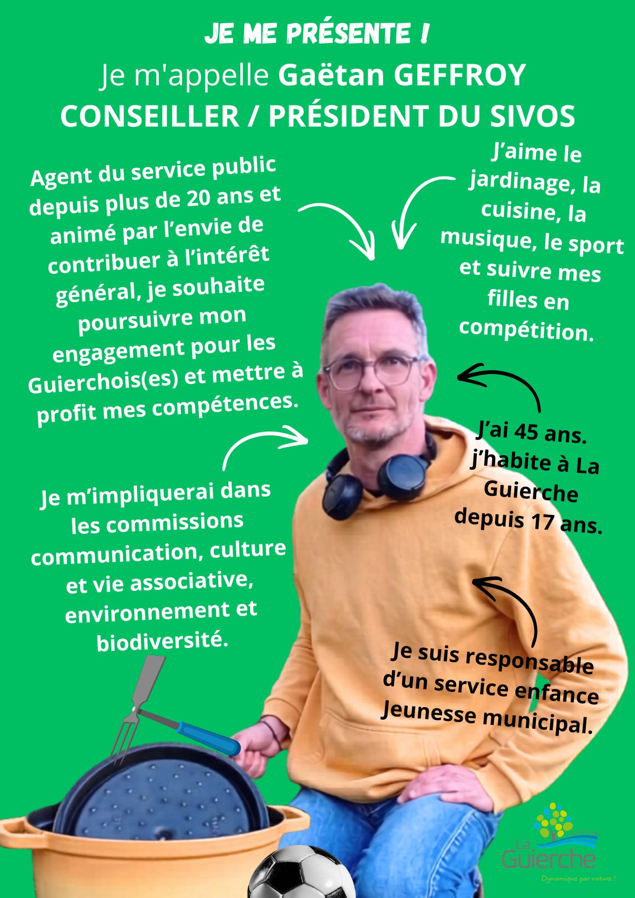 Aujourd'hui, Gaëtan GEFFROY conseiller / Président du SIVOS la Guierche - Souillé.